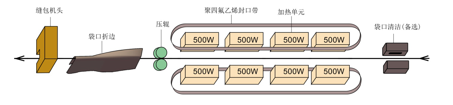 熱封縫合工作流程:袋口清潔(備選)→內(nèi)袋熱封(4組加熱塊加熱:聚四氟乙烯封口帶使加熱塊與袋子不直接接觸,以保護(hù)袋子外表不與加熱塊粘連)→壓輥壓合→袋口折邊→縫包機(jī):外袋縫紉